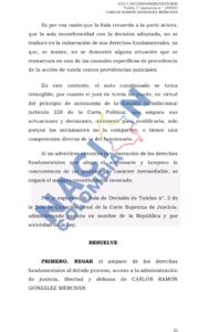 En el fallo, el alto tribunal concluyó que no se violaron los derechos fundamentales del funcionario, y que la actuación de la Sala de Instrucción Penal se ajustó plenamente al debido proceso. “Negar la tutela instaurada por el ciudadano Carlos Ramón González Merlano contra la Sala Especial de Instrucción de la Corte Suprema de Justicia, al no evidenciarse vulneración de sus derechos fundamentales”, establece la sentencia.