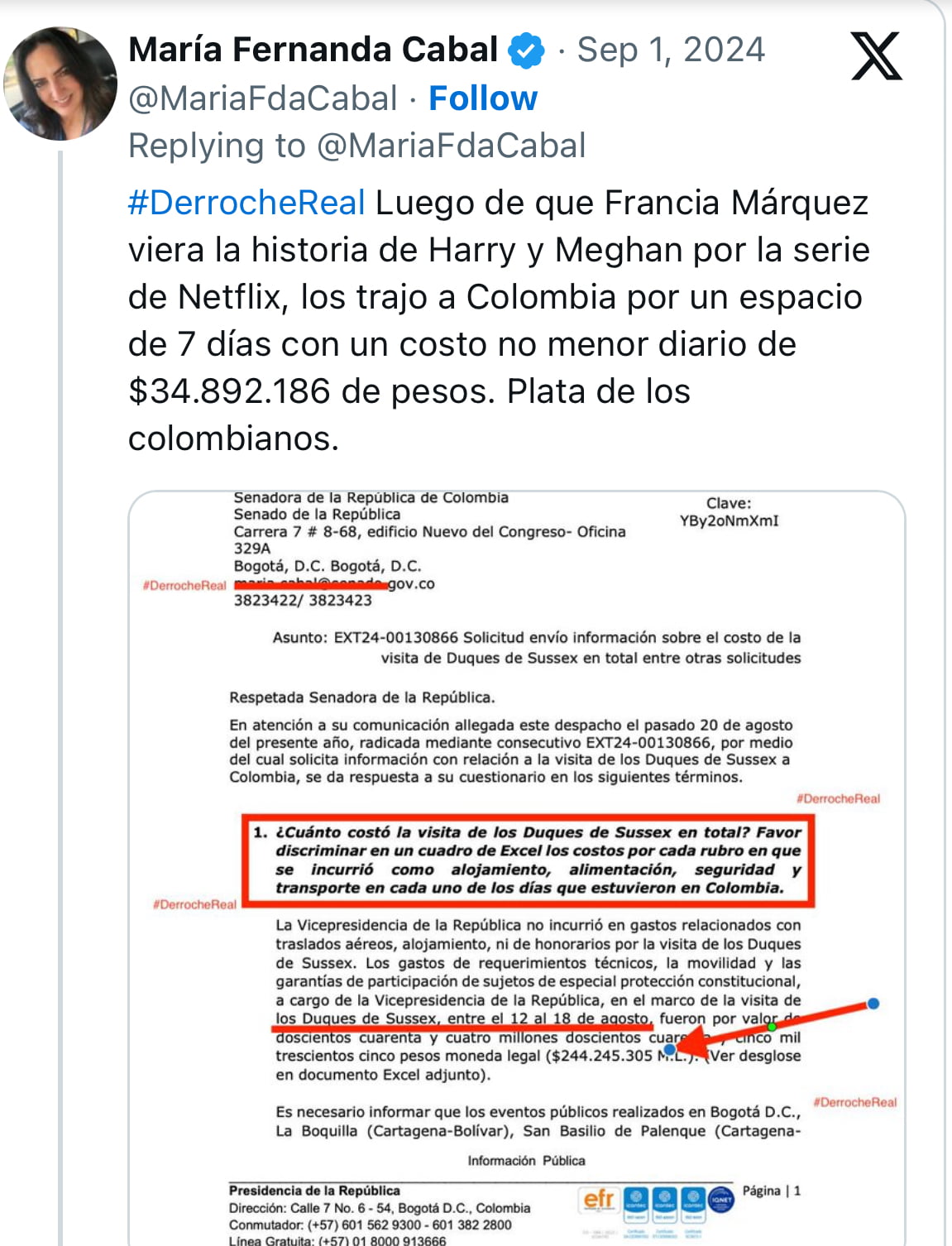 La senadora del Centro Democrático, María Fernanda Cabal, presentó un derecho de petición al Gobierno nacional para interrogar sobre los gastos finales relacionados con la visita de estas figuras públicas.