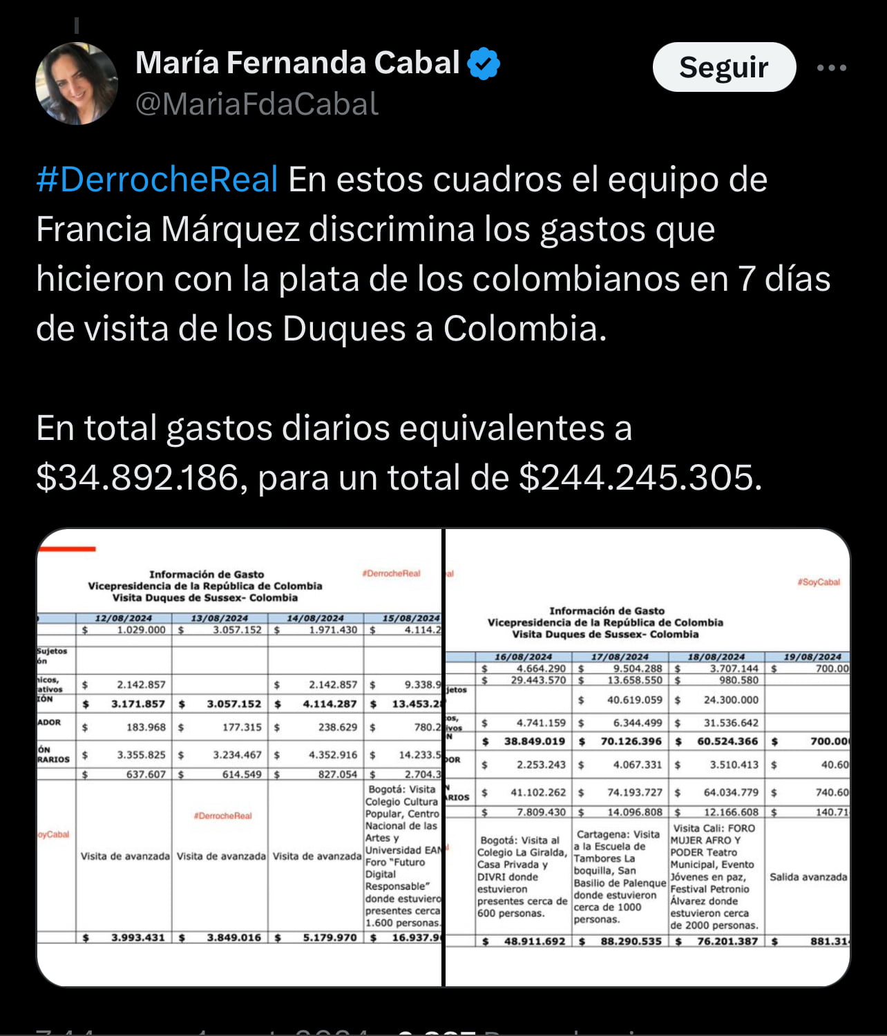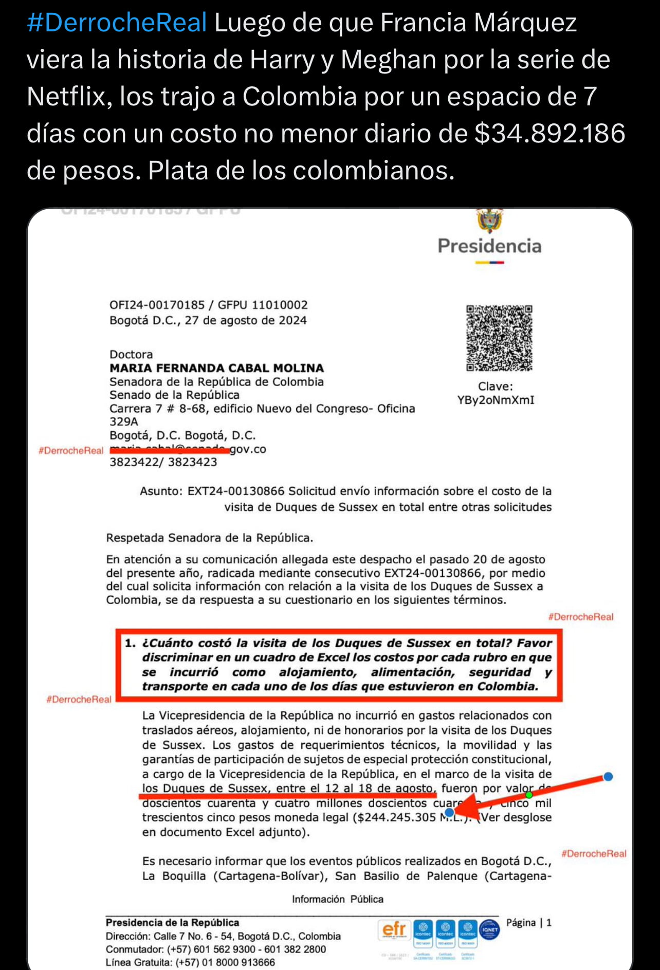 De los eventos se pasa a los costos de la reciente visita de los duques de Sussex, el príncipe Harry y Meghan Markle, a Colombia entre el 15 y el 18 de agosto de 2024, invitados por la vicepresidenta Francia Márquez.