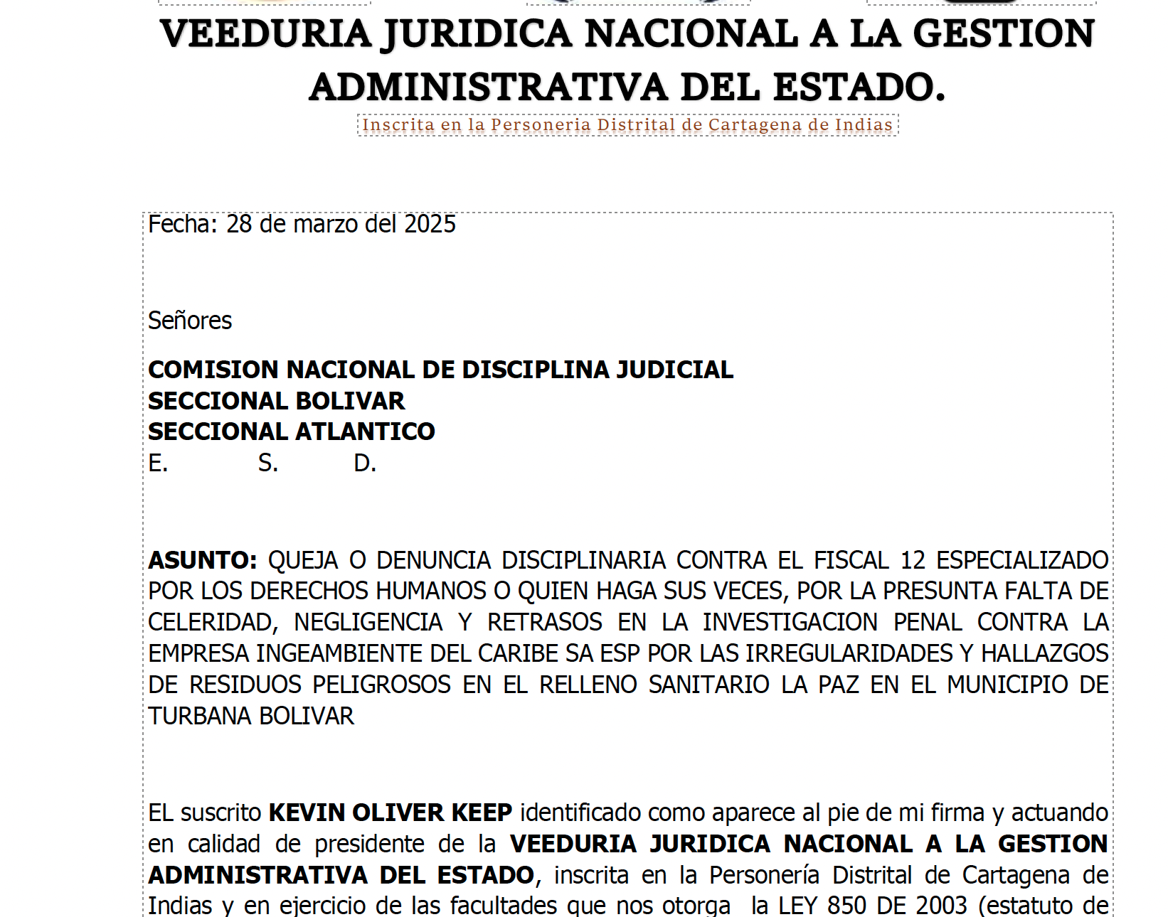 En el documento de fecha 28 de marzo, dirigido a la Comisión Nacional de Disciplina Judicial, Seccional Bolívar y Seccional Atlántico el abogado Kevin Oliver Keep, de la Veeduría Jurídica de Colombia, sostiene.