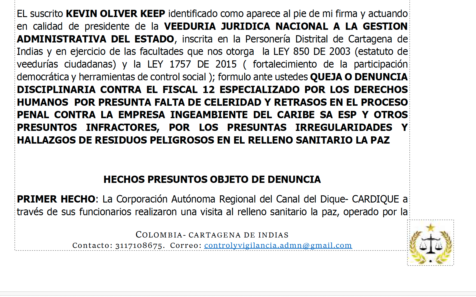 “Formulo ante ustedes queja o denuncia disciplinaria contra el Fiscal 12 especializado por los derechos humanos  por presunta falta de celeridad y retrasos en el proceso penal contra la empresa Ingeambiente del Caribe SA. ESP y otros presuntos infractores, por los presuntas irregularidades y hallazgos de residuos peligrosos en el relleno sanitario la paz”.