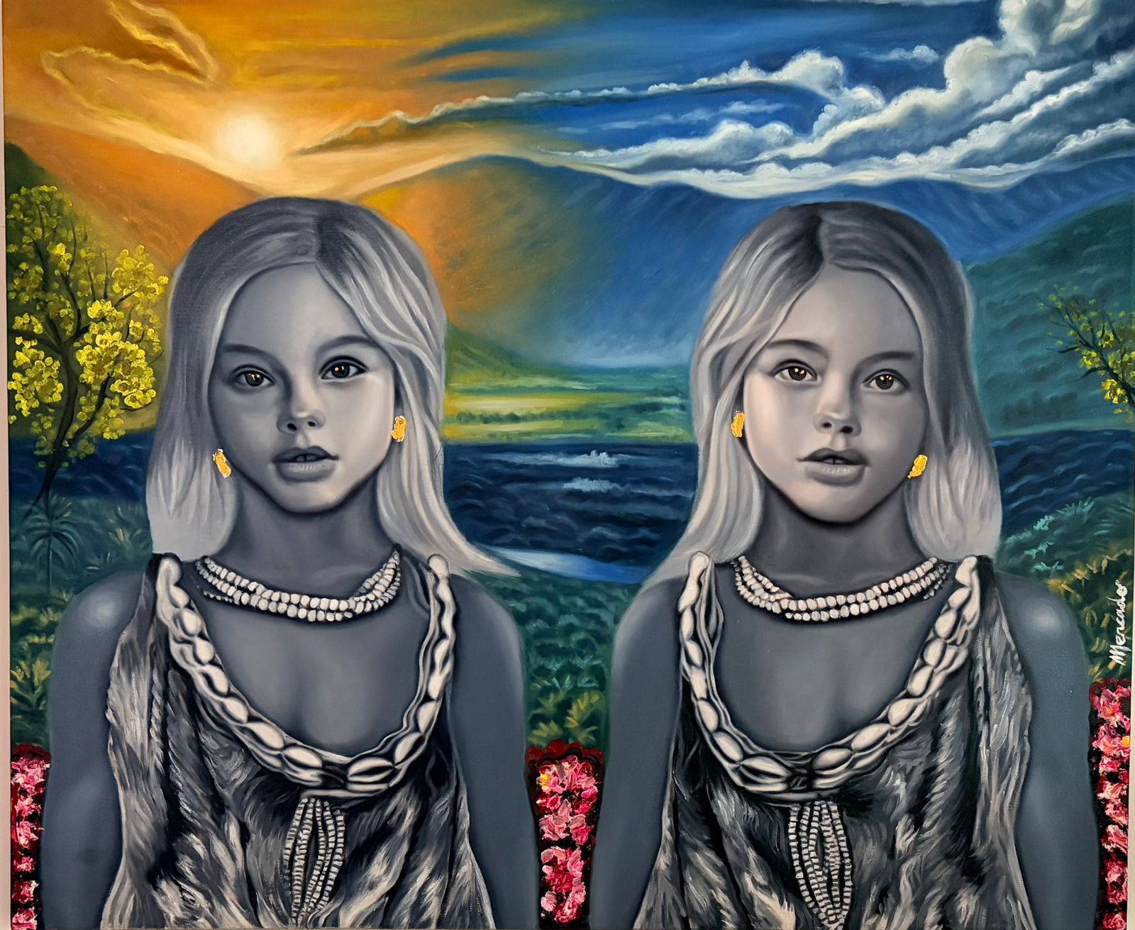 El contraste cromático refuerza este mensaje; en un lado predominan los tonos cálidos, la luz del sol y la vegetación, símbolos de vida, origen y esperanza, mientras que en el otro resaltan los azules profundos y atmósferas más frías que representan la introspección, la incertidumbre y los desafíos que enfrentan los pueblos en momentos de cambio.