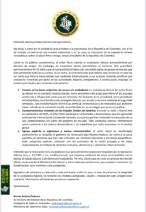 Para Palacio, estas posiciones “podrían colisionar con los principios de la Unión Europea y de Italia, especialmente en materia de derechos humanos, democracia y relaciones internacionales”. En ese sentido, pidió formalmente a Roma evaluar la permanencia de Petro como ciudadano italiano.
